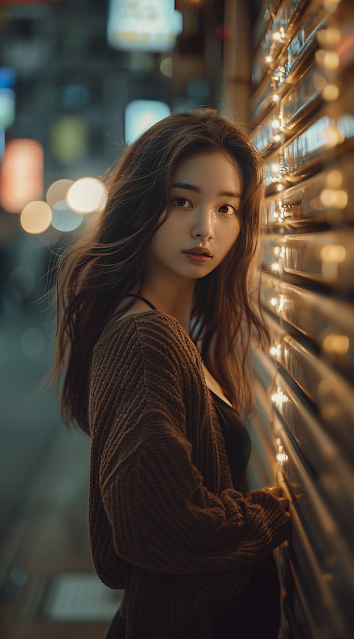 glamour shot of a Japanese 20-year-old female model with a big is leaning against the side of a building, dynamic poses, shiny big eyes tell the story, good looks full of charisma and charm, in the style of hallyu, vray tracing, dreamy, glittery and shiny, This photo was taken using Canon EOS R5 camera, presenting stunning details, extremely detail and intricate, ultra fine, photo style of Mika Ninagawa + Topaz Leung + Escher + Édouard Manet + Wong Kar - Wai, inspired by Cowboy bebop + Sailor moon, cinematic lighting, hyper realistic photography, ultra realistic --ar 71:128 --v 6.0