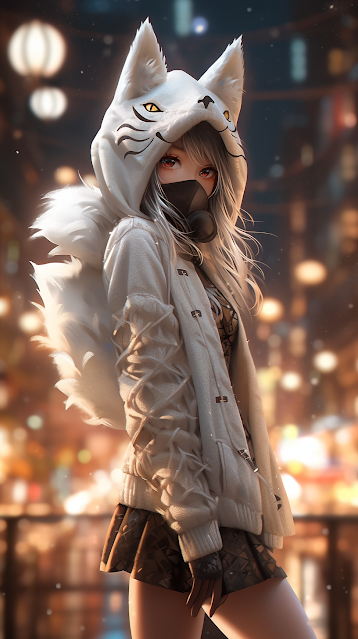 Realistic hyper detail, photo real, 3D, computer graphics art, cinematic photo still, full body shot of a cute and adorable Japanese 20-year-old woman in a white animal skin coat, with a mask, photorealistic shiny eyes, shorts, leather boots, autumn, moon, night, cinematic lighting, falling randomly to create a bright and erratic atmosphere, detailed urban city background, made of cheese, a lazy and lovely woman, aesthetic in the style of Hallyu, sparklecore, zeiss batis 85mm f/ 2. 2, dreamy --style raw --ar 9:16 --niji 6