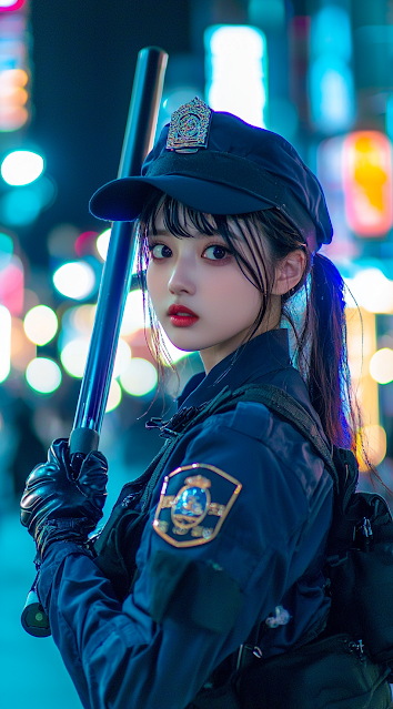 cinematic photo still, glamour shot of a 20-year-old Japanese female model cosplay the police, holding the baton on hand, wearing police custom, walking on the shibuya street, halloween event, detail baton, This photo was taken by using Canon EOS R5 camera, presenting stunning details, extremely detail and intricate, ultra fine, photo style of Mika Ninagawa + Topaz Leung + Escher + Édouard Manet + Wong Kar - Wai, inspired by Cowboy bebop + Sailor moon, cinematic lighting, hyper realistic photography, ultra realistic --ar 71:128 --v 6.1 --q 2