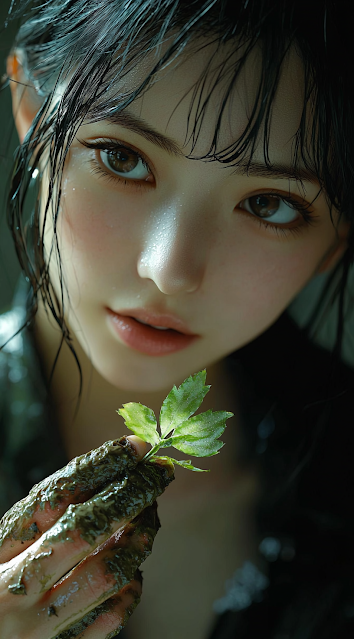 cinematic photo still, glamour shot of a 20-year-old Japanese female model, holding the green fresh verdue young leaf of the mud on hand, shiny smart eyes look at the fresh verdue young leaf, smile, vivid small young leaf, dreamy colors, This photo was taken by using Canon EOS R5 camera, presenting stunning details, extremely detail and intricate, ultra fine, photo style of Mika Ninagawa + Topaz Leung + Escher + Édouard Manet + Wong Kar - Wai, inspired by Cowboy bebop + Sailor moon, cinematic lighting, hyper realistic photography, ultra realistic